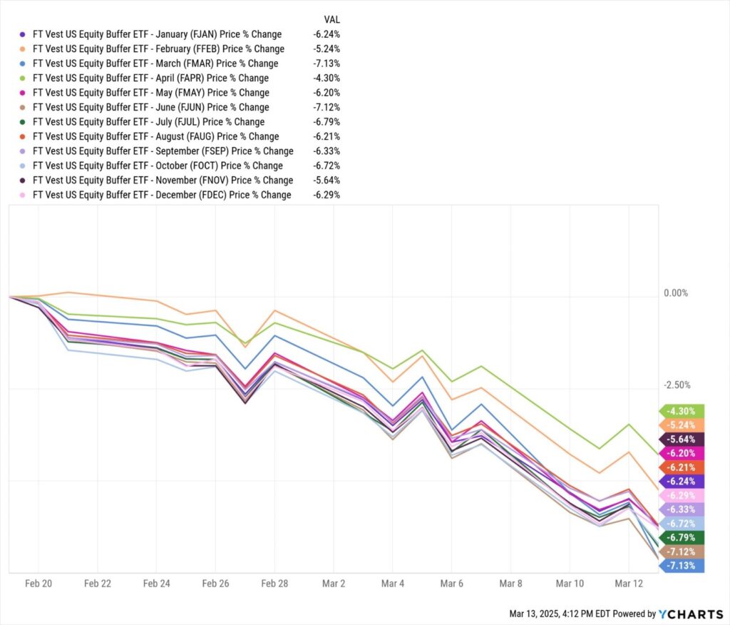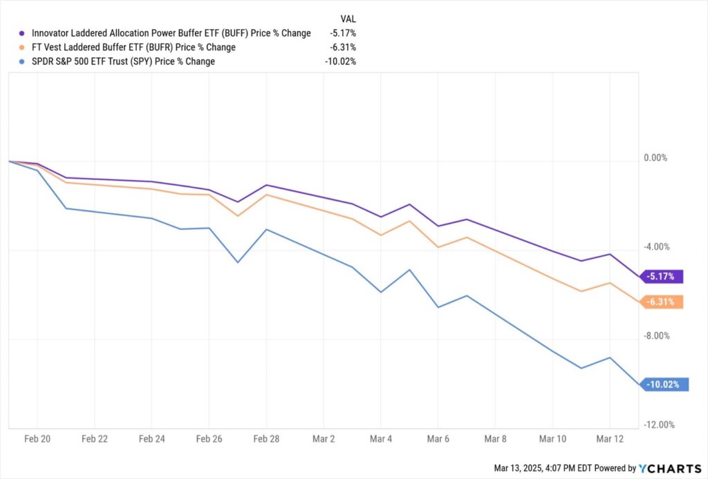 By way of example, let’s look at the range of returns we have seen from buffered ETFs since the market peaked on February 19th, 2025, and through Thursday, March 13, 2025. Let’s start with First Trust’s laddered buffered ETF strategy BUFR and Innovator’s laddered buffered ETF strategy BUFF. We see first below that these two laddered products indeed provide downside protection as advertised. Since the downturn started on February 19th, the SPY ETF is down -10.02% while BUFR is down -6.31% and BUFF is down -5.17%. In both cases, this is decent downside protection.