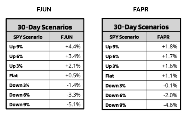 In a down 10% market, we knew in advance that FJUN (-7.12%) would be down more than FAPR (-4.3%). In this instance, FJUN did worse than represented in the scenario tables, while FAPR did a little better. The reasons are highly nuanced related to the pricing of options, and the factors involved in options pricing like time, volatility pricing, and changes in volatility. But if investors knew in advance of these potential moves, they would have known full protection of the downside move was not possible with these instruments.